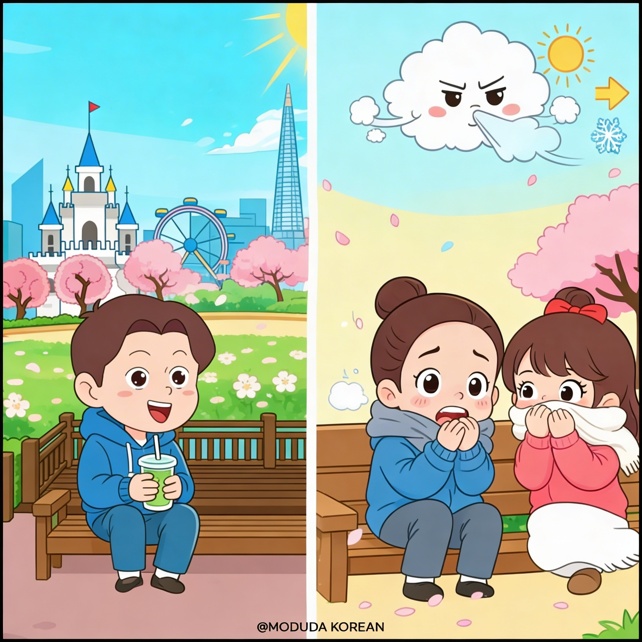 「꽃샘추위가 왔어요。」 春寒來了。