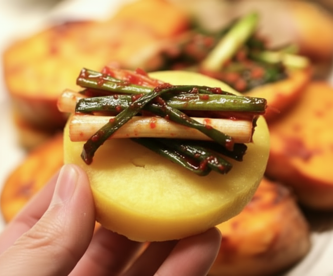 紅薯的甜味和小蔥辛奇的辣味很相配。